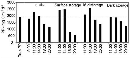 Daily primary production in phytoplankton sampled at 8:00, stored under different light conditions and sub-sampled every 2-4 hours.