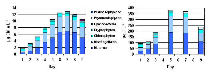 色素分析高压液体Chromatography (HPLC) is a rapid, very sensitive and objective method for determining the phytoplankton composition and for estimating the biomass of the different algal groups. Investigations in Danish waters have proven a high correlation between algal composition determined from pigments (left) and from microscopical analysis (right)(Schlüter & Havskum, 1997, Schlüter et al. 2000).